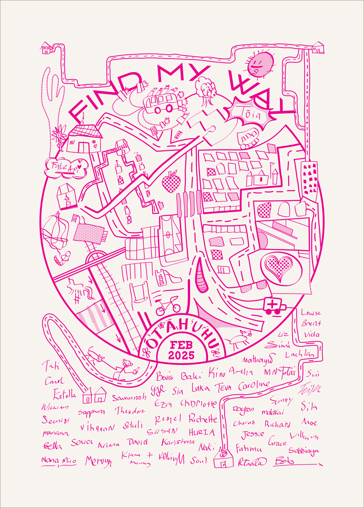 We Should Practice ran a drop-in map-making event at Tōia (Ōtāhuhu Library) where approximately 60 participants of all ages were asked to share walking, cycling and driving journeys to, in and around Ōtāhuhu. They could draw them in whatever way they liked, and in as much or as little detail as they liked.