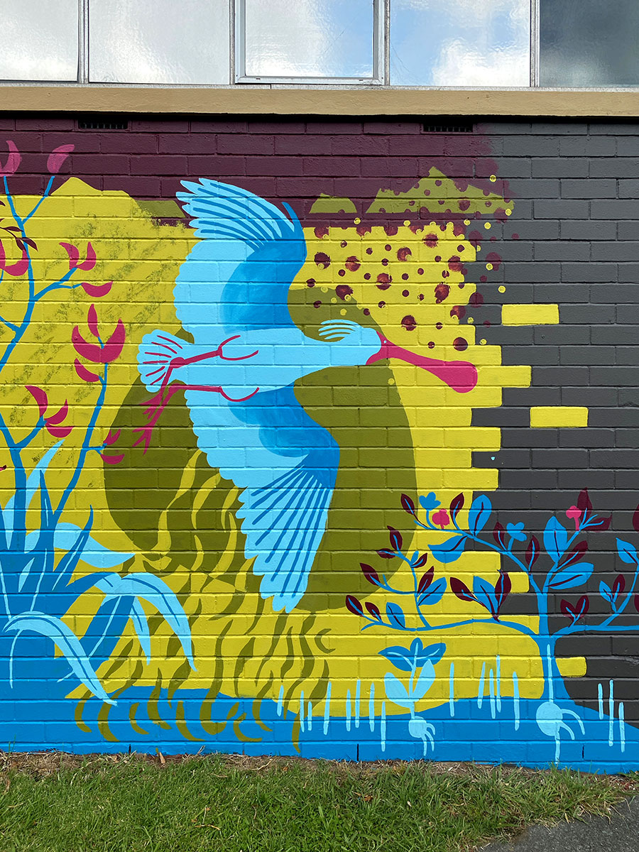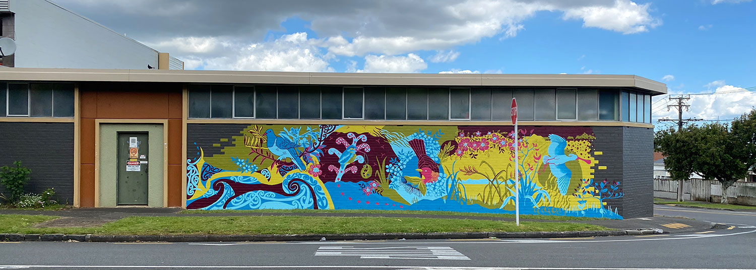 A group project with Kim Littlejohn (working together on our section) and Anna Tang, Amrit Kaur, Sinivia Williams and Kahu Hurae. We worked on a long wall opposite Onehunga Primary School.